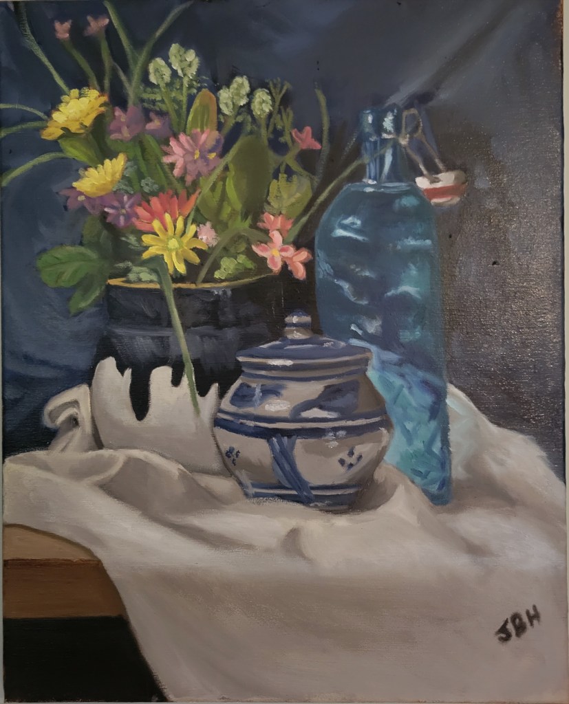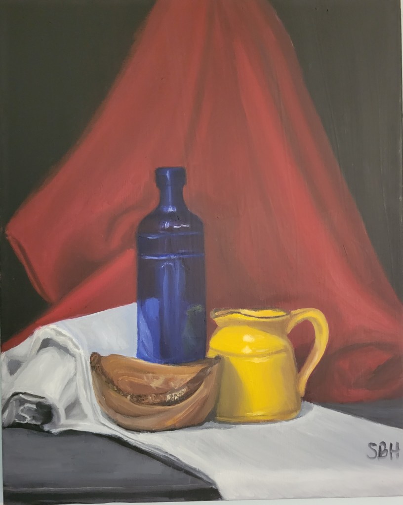 In the two images below, I also seem to have gotten better at “doing” cloth. These are about 3 years apart. The bottles are another story.
