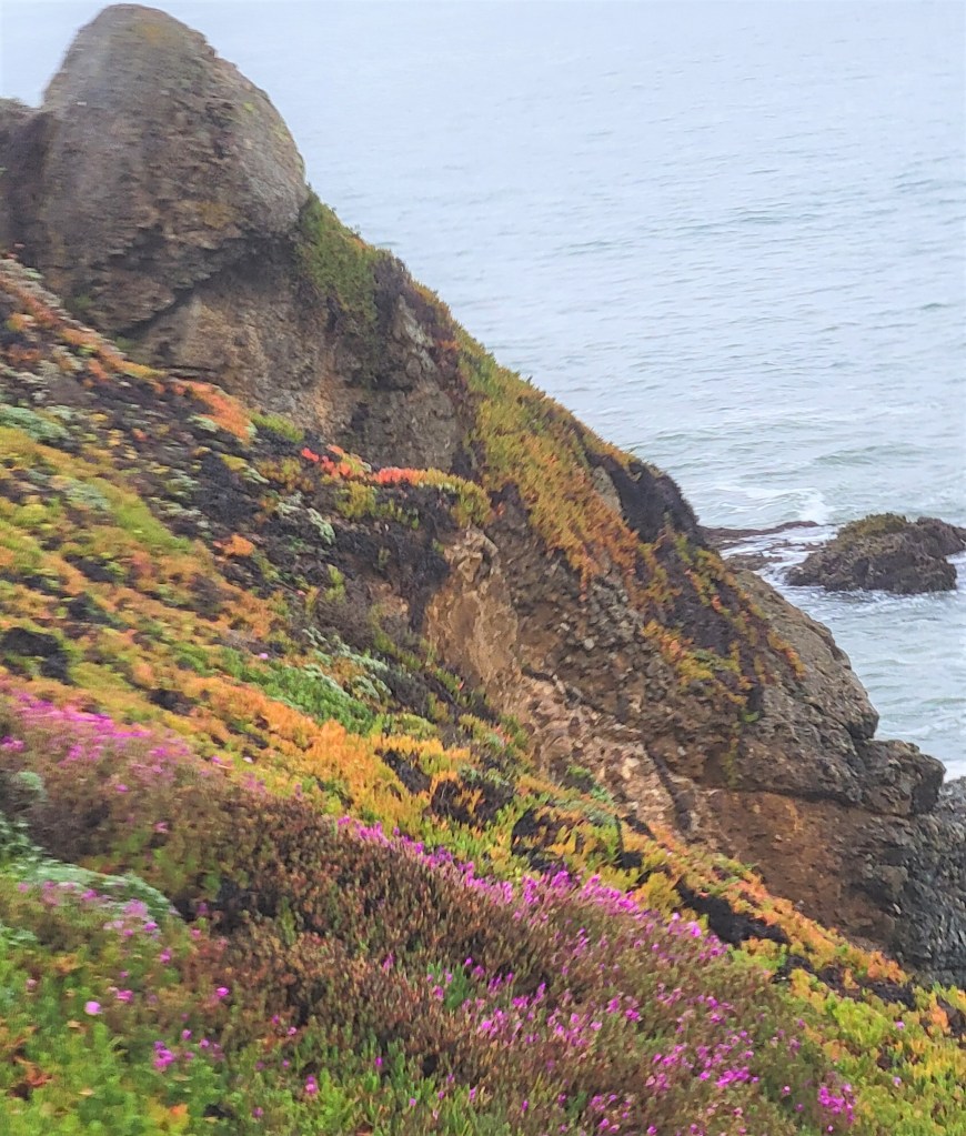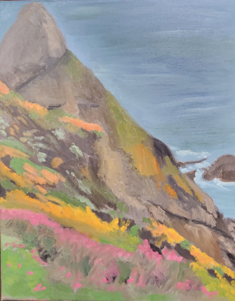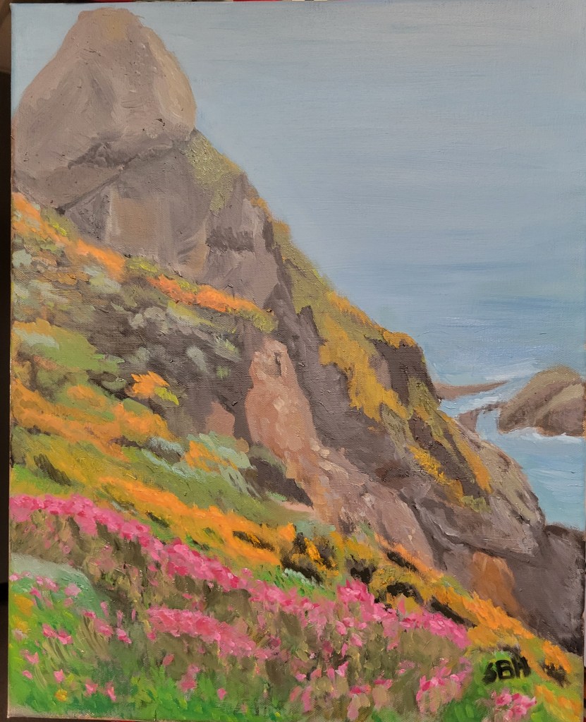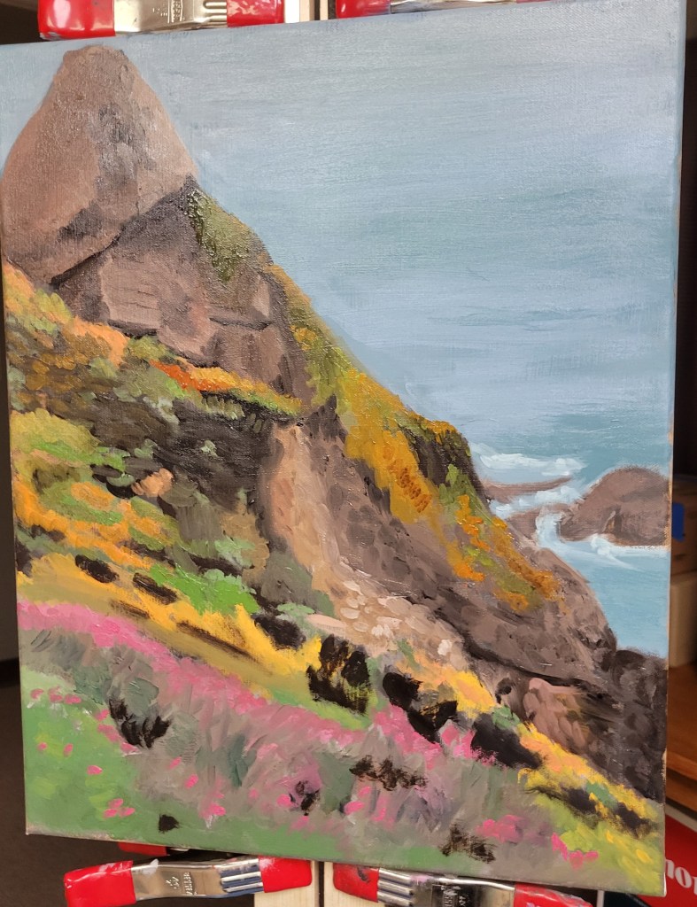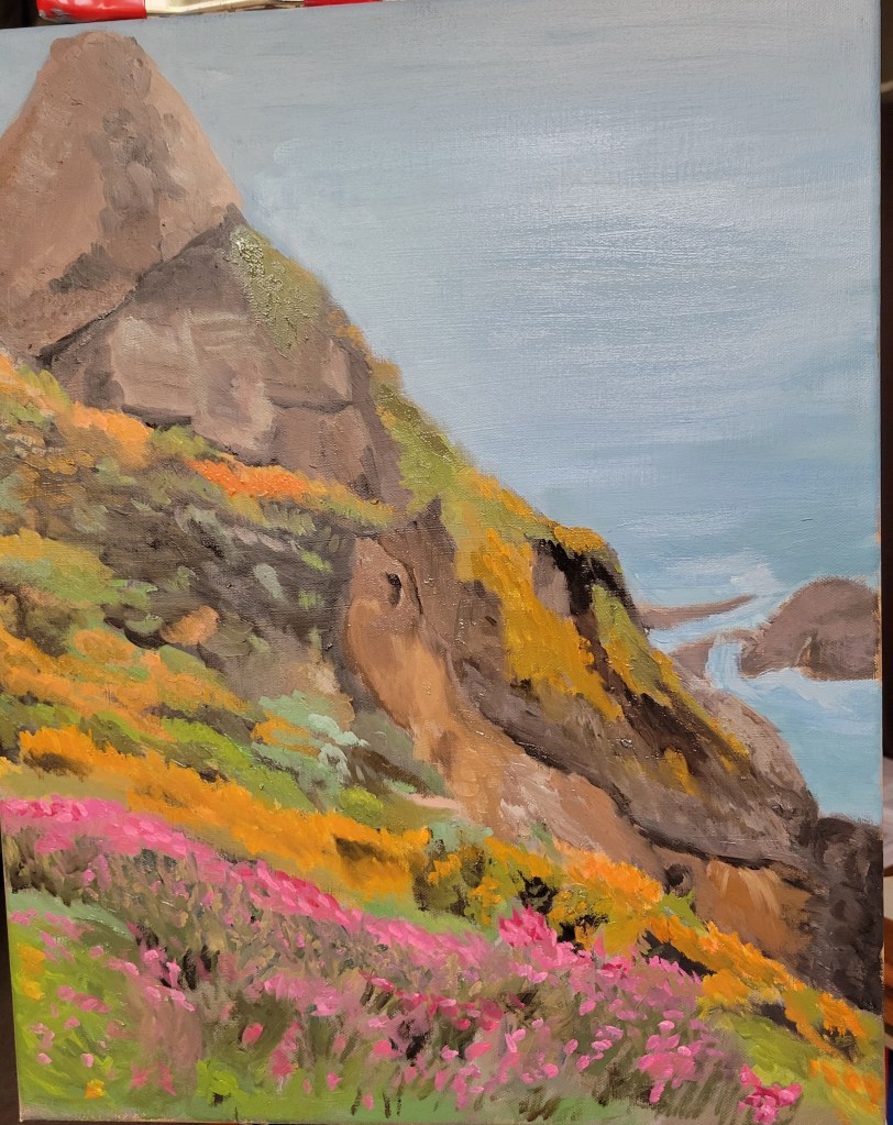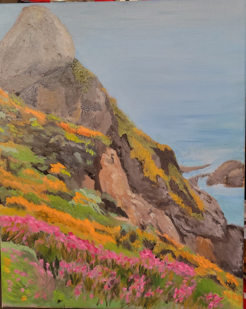 I usually work from photographs. The photographs are typically ones that I have taken, but sometimes others will send me a picture that really strikes me so I ask permission to paint it. The interesting things about photographs is that they show more than the eye actually sees, so the trick for the artist is to capture what the eye might see from a photograph. One of the things that I always need to work on is allowing things to recede into the distance. Our eyes don’t see things in the distance in the same way they do in the foreground, but photographs sometimes show them with the same detail. Or the color is not as different as it is when we look at something. It has been an interesting journey to determine what to keep and what to have fade into the distance. Here is my latest from start to finish. It is a picture I took on the California coast near San Francisco. It was a misty cloudy day, so I tried to make the painting represent a bit more sun.