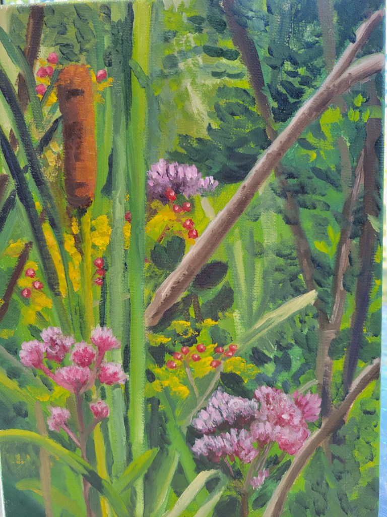 Finally, I have been watching a tv series from the UK, “The Landscape Artisit of the Year.” It is a contest, and you watch 6-8 artists paint various landscapes in four hours. I’m not sure I can do much in 4 hours, but I gave it a shot. I sat outside and worked on a small canvas hoping to move to plein air painting, where you paint what you see outside in real time. This time I used a photograph. It is one of mostly greenery which I have learned from the show that most artists struggle with, which in some ways made me feel better. This isn’t quite finished, but I thought I would show you anyway. This is the 4 hour version: