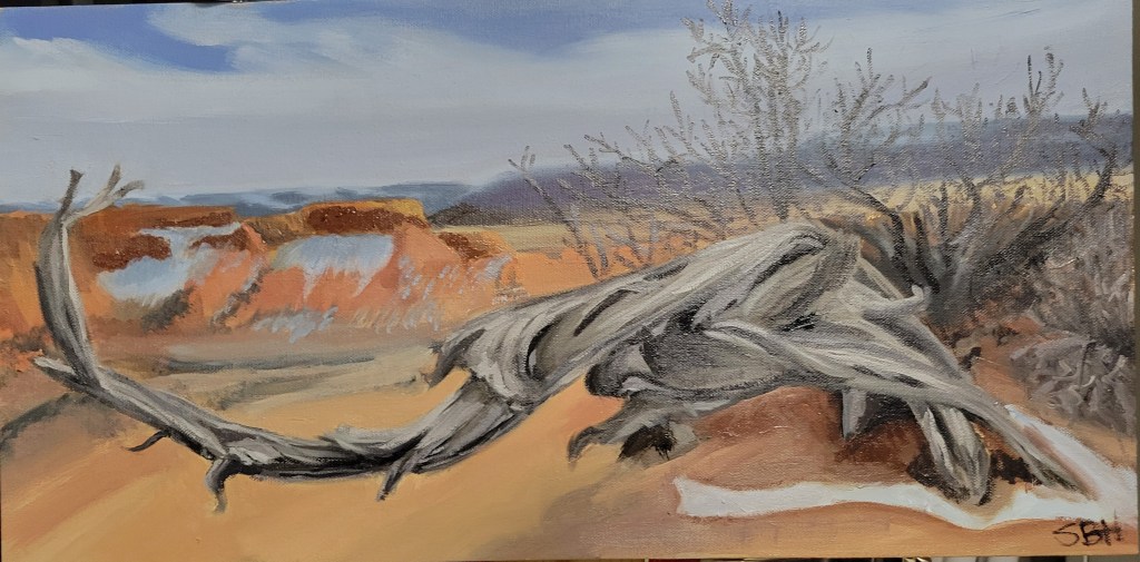 Again, I seem to be lax in my posting. I have been busy however. I have another still life for my portfolio and I have moved on to landscapes. I visted New Mexico last spring and took lots of pictures. I noticed a theme in my photographs of “dead wood.” This has a meaning for me in that I am now about 5 semesters away from retirement and many professors that are that close to retirement are considered “dead wood” as in no longer publishing or being productive. I’m not being unproductive, but the label is still interesting to me. As I perused the pictures I took, I realized that dead wood can be beautiful in a rugged sort of way, and I am fascinated by how it adds to the landscape of the desert.