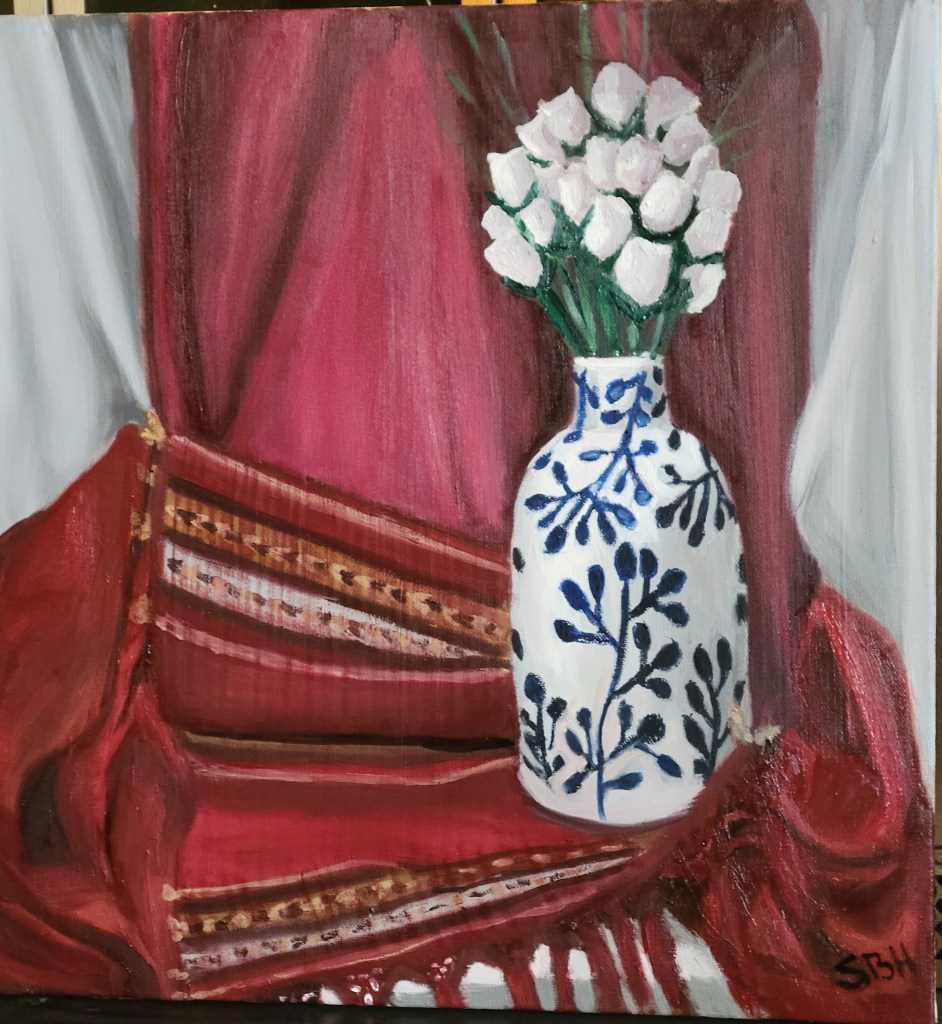 The still life was an effort to add more cloth, and get a shine on the cloth. I’m not sure the picture of the painting makes that clear but I think I was successful in doing that.