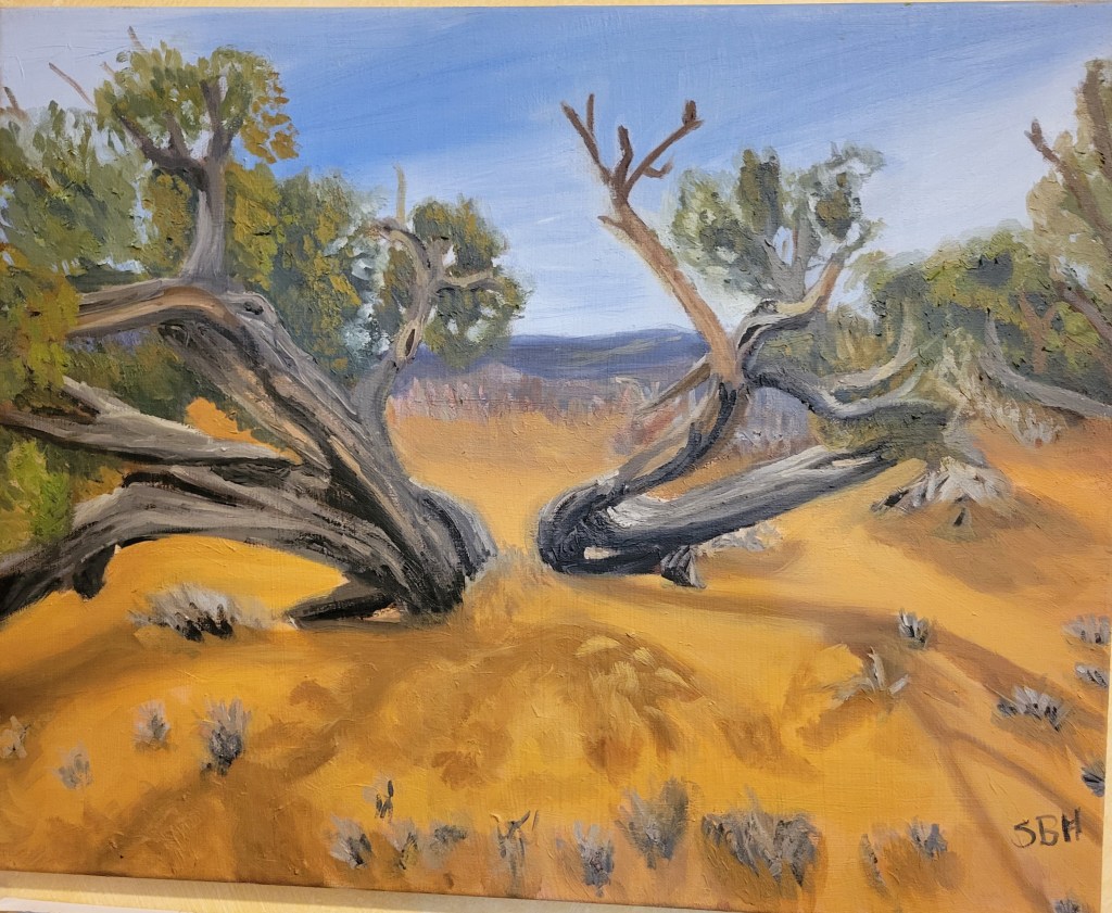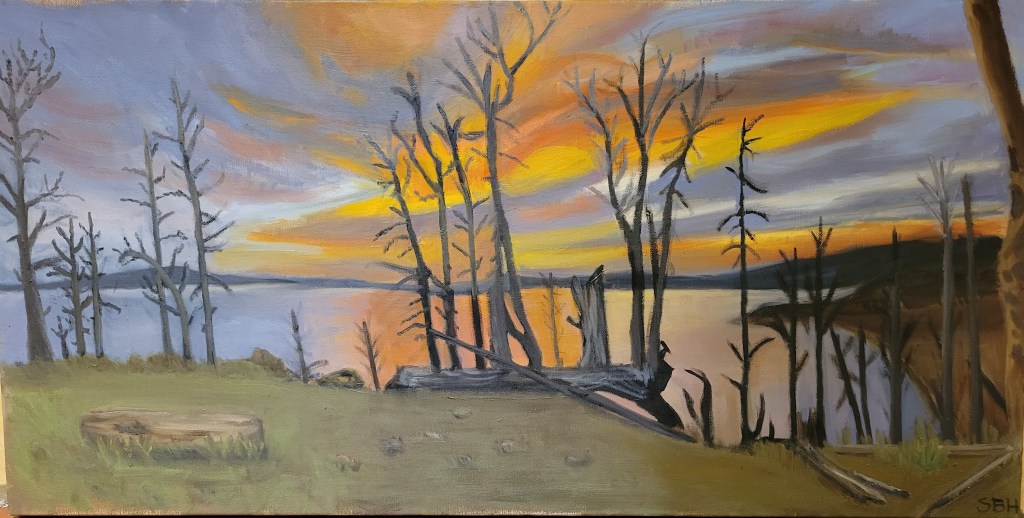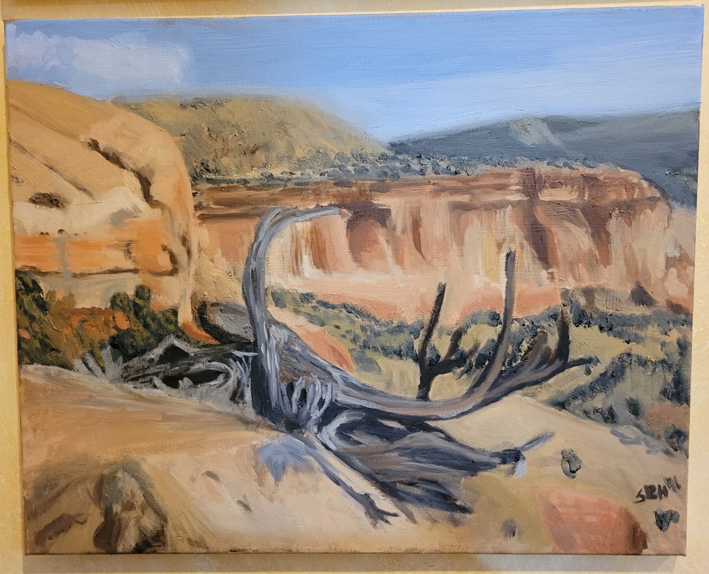 I am apparently not good at this social media thing. I have been working on pieces. I finished my “dead wood” set of pieces and “practiced” on some portraits and then did a sunset. I like it all, so I don’t have a particular area that I want to concentrate on at this point. Currently, I have a commission! I am working on a double portrait of a dad with his daughter. It is pretty big, so I can get some details in and I have been really concentrating on skin tone. My mentor, Michael Cooley, said something really interesting about skin when I was in the studio. He said that skin reflects light from the external environment but is also many layered, so as the light refracts it changes color. Trying to capture that in paint is why portraiture is so difficult. I guess that is why the masters were considered the masters. I think about Rembrant, Titian and many others that seemed to have mastered the art of skin. I’m still working on it.
